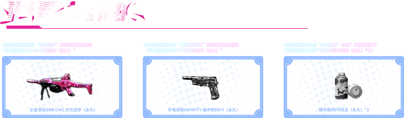 (永久)”/拥有全部“次元造梦”以及”城市数码fx”系列武器可以领取"城市数码FX喷漆(永久)"x2。