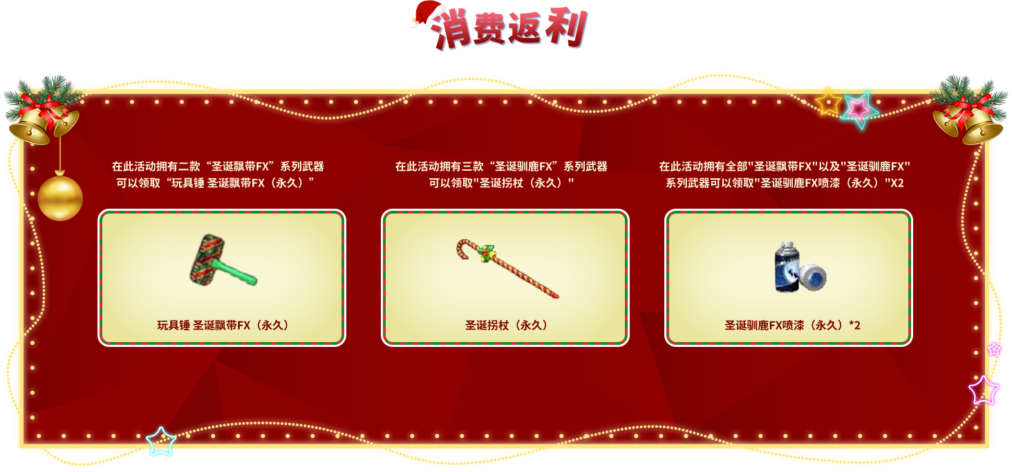 4、消费返利:在此活动拥有二款“圣诞飘带FX”系列武器可以领取“玩具锤 圣诞飘带FX(永久)”/在此活动拥有三款“圣诞驯鹿”系列武器
