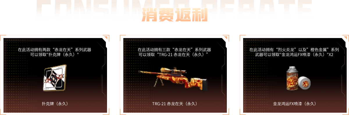 4:消费返利:在此活动拥有两款“赤龙在天”系列武器可以领取"扑克牌(永久)"/拥有三款“赤龙在天”系列武器可以领取“TRG-21 赤龙在天(永
